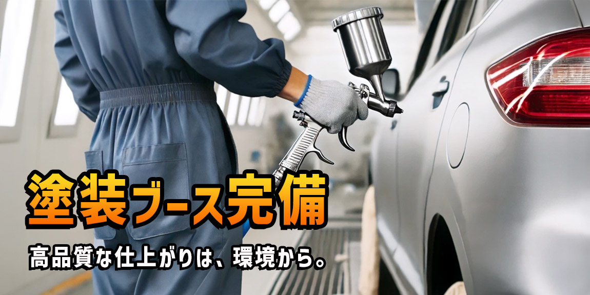 塗装ブースを完備し、板金・塗装のすべてを自社内で対応しています。ホコリを防ぐ専用環境で細かな色調整にも対応可能。